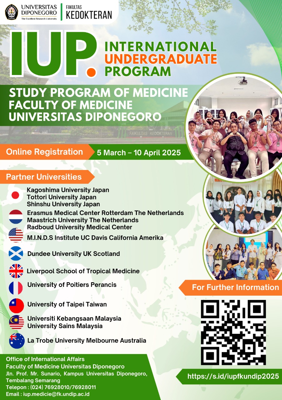 Program Studi Kedokteran Fakultas Kedokteran Universitas Diponegoro (FK Undip) kembali membuka pendaftaran untuk International Undergraduate Program (IUP) 2025! Program ini memberikan peluang luar biasa bagi calon mahasiswa yang ingin mendapatkan pendidikan kedokteran berkualitas dengan wawasan global serta pengalaman belajar di universitas mitra ternama di dunia.
